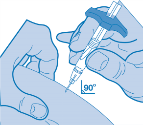 Drücken Sie die Haut mit zwei Fingern zu einer Hautfalte zusammen und stechen Sie die Nadel in einem 90-Grad-Winkel schnell in die Haut ein.