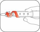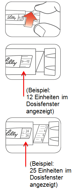Schritt 9: ·Drehen Sie den Dosierknopf bis zu der Zahl an Einheiten, die Sie spritzen müssen. Die Dosisanzeige sollte sich auf einer Linie mit Ihrer Dosis befinden. ·Der Pen dosiert in 1er-Schritten. ·Beim Drehen des Dosierknopfs hören Sie ein Klicken. ·Stellen Sie Ihre Dosis NICHT durch Zählen der Klicks ein, denn Sie könnten so die falsche Dosis einstellen. ·Die Dosis kann durch Drehen des Dosierknopfs in beide Richtungen korrigiert werden, bis sich die richtige Dosis auf einer Linie mit der Dosisanzeige befindet. ·Die geraden Zahlen sind auf der Skala angegeben. ·Die ungeraden Zahlen nach der Ziffer 1 sind als durchgehende Linie zu sehen. ·Überprüfen Sie immer die Angabe im Dosisfenster um sicherzustellen, dass Sie die korrekte Dosis eingestellt haben.