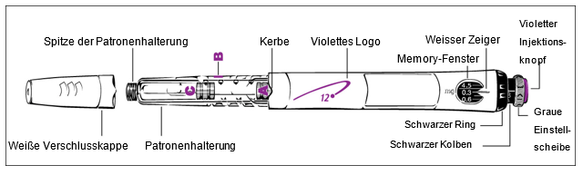 ·Sollte der Pen heruntergefallen sein, müssen Sie ihn wieder laden, wie in Schritt 5 der Gebrauchsanweisung beschrieben. Falls ein Teil Ihres Pens in irgendeiner Weise beschädigt erscheint, verwenden Sie den Pen nicht. Wenden Sie sich an Ihren Arzt/Ihre Ärztin oder eine medizinische Fachperson um einen anderen Pen zu beziehen.