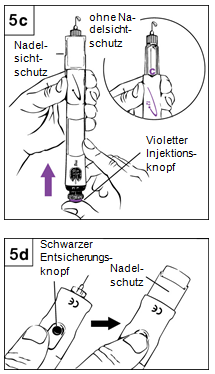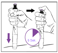 7.Bereiten Sie eine Injektionsstelle vor, wie von Ihrem Arzt/Ihrer Ärztin bzw.der medizinischen Fachperson gezeigt. 8.Verabreichen Sie sich die Injektion. • Drücken Sie den Pen nach unten, um die Nadel durch die Haut zu stechen. • Drücken Sie den grünen resp. violetten Injektionsknopf nach unten, bis kein Klicken mehr zu hören ist. • Zählen Sie langsam bis 5 (5 Sekunden), bevor Sie die Nadel wieder aus der Haut ziehen. Während Sie zählen, halten Sie den Daumen weiterhin leicht auf den Knopf gedrückt. • Ziehen Sie den Pen gerade aus der Haut heraus.
