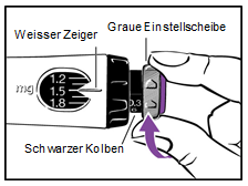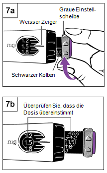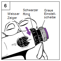 Schritt 6 Einstellen der Dosis ·Verwenden Sie den schwarzen Ring um die Dosis einzustellen. Achten Sie beim Drehen darauf, dass sich die graue Dosiseinstellscheibe nicht mitdreht. a.Halten Sie den schwarzen Ring wie in Abbildung 6 dargestellt. b.Drehen Sie den schwarzen Ring bis Ihre Dosis und der weisse Zeiger auf einer Linie stehen. Ihr Arzt, Ihre Ärztin bzw. die medizinische Fachperson haben Ihnen die Dosis mitgeteilt. c.Falls Sie Ihre Dosis über den weissen Zeiger hinaus gedreht haben, drehen Sie den schwarzen Ring einfach bis zur richtigen Dosis zurück. d.Wenn Sie Ihre Dosis einmal eingestellt haben, verändern Sie diese nicht mehr, es sei denn, es wird von Ihrem Arzt/Ihrer Ärztin angeordnet. Falls Sie den schwarzen Ring nicht drehen können, drücken Sie den grünen resp. violetten Injektionsknopf bis kein Klicken mehr zu hören ist. Fahren Sie dann mit der Dosiseinstellung mittels des schwarzen Ringes fort.