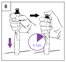 Schritt 8 Verabreichen einer Injektion (Abbildung mit Nadelsichtschutz) a.Bereiten Sie eine Injektionsstelle vor, wie von Ihrem Arzt/Ihrer Ärztin bzw. der medizinischen Fachperson gezeigt. b.Halten Sie den Pen über die Injektionsstelle. c.Drücken Sie den Pen nach unten, um die Nadel durch die Haut zu stechen. d.Drücken Sie nun mit dem Daumen den grünen resp. violetten Injektionsknopf hinunter, bis kein Klicken mehr zu hören ist (Abbildung 8). • Zählen Sie langsam bis 5 (5 Sekunden), bevor Sie die Nadel wieder aus der Haut ziehen. Halten Sie, während Sie zählen, den Daumen weiterhin leicht auf den Knopf gedrückt. e.Ziehen Sie den Pen gerade aus der Haut heraus.
