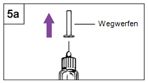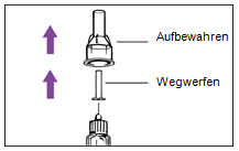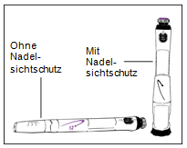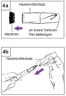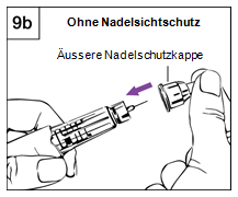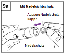 Schritt 9 Entfernen der Nadel, Verschliessen und Aufbewahren des Pens Schritt 9a: Variante mit Nadelsichtschutz a.Stecken Sie die äussere Nadelschutzkappe wieder auf den Nadelschutz (Abbildung 9a). b.Benutzen Sie die Nadelschutzkappe, um den Nadelschutz hinunterzudrücken, bis er einrastet. c.Schrauben Sie die Nadel mithilfe der Nadelschutzkappe ab und entsorgen Sie diese in einem für gebrauchte Nadeln geeigneten, nicht durchstechbaren und geschlossenen Abfallbehälter. d.Lassen Sie den Nadelsichtschutz auf dem Pen. e.Stecken Sie die schwarze Verschlusskappe auf den Nadelsichtschutz. Bewahren Sie den Pen im Kühlschrank auf. Schritt 9b: Variante ohne Nadelsichtschutz a.Berühren Sie die Nadel nicht! b.Verschliessen Sie die Nadel vorsichtig mit der äusseren Nadelschutzkappe (Abbildung 9b). c.Schrauben Sie die Nadel mithilfe der Nadelschutzkappe ab und entsorgen Sie diese in einem für gebrauchte Nadeln geeigneten, nicht durchstechbaren und geschlossenen Abfallbehälter. d.Stecken Sie die weisse Verschlusskappe auf den Pen. Bewahren Sie den Pen im Kühlschrank auf.