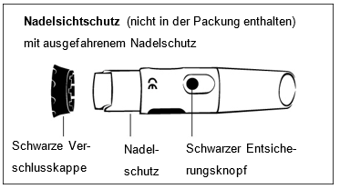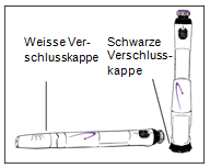 1.Ziehen Sie die schwarze Verschlusskappe vom Nadelsichtschutz oder die weisse Verschlusskappe vom Pen.