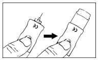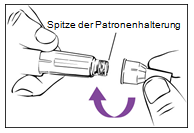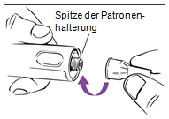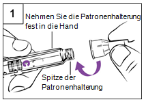 Schritt 1 Anbringen der Nadel a.Ziehen Sie die weisse Verschlusskappe gerade vom Pen ab. b.Ziehen Sie das Verschlusssiegel von einer neuen Nadel ab. c.Halten Sie die Patronenhalterung fest in der Hand (Abbildung 1). d.Stecken Sie die Nadel auf die Spitze der Patronenhalterung. e.Schrauben Sie die Nadel vorsichtig auf den Pen. Nicht zu fest anziehen! f.Lassen Sie beide Nadelschutzkappen auf der Nadel.