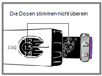 Sie haben wahrscheinlich die graue Dosiseinstellscheibe gedreht. Die schwarze Memory-Einstellscheibe wird vom Pen gesperrt, so dass sich Ihre Dosis während der Injektion nicht verändern kann. Drücken Sie den grünen resp. violetten Injektionsknopf, um die schwarze Memory-Einstellscheibe zu entsperren. Denken Sie daran, dass aus der Nadel etwas Flüssigkeit austritt. Stellen Sie dann Ihre Dosis ein.