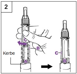 Schritt 2 Auflösen des Genotropins a.Halten Sie den Pen so, dass die Nadel nach oben zeigt und die Markierung A Ihnen zugewandt ist (Abbildung 2). b.Drehen Sie die Patronenhalterung im Uhrzeigersinn kräftig in den Pen hinein, bis B (Markierung C wandert dabei nach links) in die Kerbe einrastet. • Schwenken Sie den Pen leicht hin und her. Schütteln Sie den Pen nicht! Schütteln kann das Wachstumshormon schädigen. c.Überprüfen Sie, ob die Flüssigkeit in der Patrone klar ist. Das Pulver muss vollständig aufgelöst sein. • Sollte das nicht der Fall sein, schwenken Sie den Pen etwas länger leicht hin und her. d.Überprüfen Sie nochmals die Flüssigkeit. Vergewissern Sie sich, dass diese jetzt klar ist. • Wenn die Flüssigkeit klar ist, gehen Sie zu Schritt 3. • Falls die Flüssigkeit immer noch trüb ist oder weiterhin Pulver zu sehen ist, nehmen Sie einen neuen Pen.