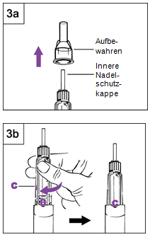 Schritt 3 Entfernen der Luft a.Ziehen Sie die äussere Nadelschutzkappe von der Nadel ab. Bewahren Sie diese auf, damit Sie sie später wieder auf die Nadel setzen können (Abbildung 3a). b.Lassen Sie die innere Nadelschutzkappe auf der Nadel stecken. c.Halten Sie den Pen mit der Nadel nach oben (Abbildung 3b). d.Klopfen Sie leicht auf die Patronenhalterung, damit eingeschlossene Luft nach oben steigen kann. e.Drehen Sie kräftig im Uhrzeigersinn an der Patronenhalterung bis C in die Kerbe einrastet. • Es sollte etwas Flüssigkeit aus der Nadel austreten und in der inneren Nadelschutzkappe sichtbar sein.