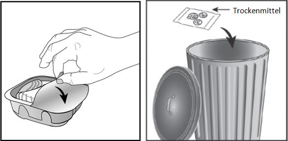 Der Inhalator ist in einem Schutzbehälter verpackt. Bitte öffnen Sie diesen erst, wenn Sie bereit sind für die Inhalation. Dann entfernen Sie die Schutzfolie, um den Behälter zu öffnen. Dieser enthält ausserdem ein Trockenmittelpäckchen zur Feuchtigkeitsreduktion. Bitte entsorgen Sie das Trockenmittelpäckchen. Dieses darf nicht geöffnet, geschluckt oder eingeatmet werden.