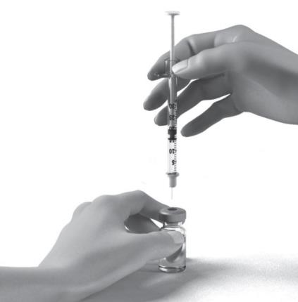 4.Überprüfen Sie, dass die richtige Menge Lösung aufgezogen wurde, und überprüfen Sie die Spritze auf Luftblasen, bevor Sie die Nadel aus der Durchstechflasche entfernen. Falls Blasen in der Spritze auftreten, halten Sie die Spritze mit der Nadel nach oben und klopfen Sie vorsichtig gegen die Seite der Spritze, bis die Blasen nach oben steigen. 5.Sobald alle Blasen oben in der Spritze sind, drücken Sie leicht auf den Kolben, um die Blasen aus der Spritze und zurück in die Durchstechflasche zu drücken.