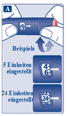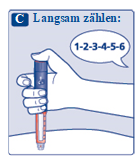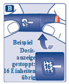 Achten Sie immer auf die Dosisanzeige, um zu wissen, wie viele Einheiten Sie injizieren. Die Dosisanzeige gibt die genaue Anzahl der Einheiten an. Zählen Sie nicht die Klickgeräusche des Fertigpens. Halten Sie den Injektionsknopf solange gedrückt bis die Dosisanzeige nach der Injektion wieder auf 0 steht. Wenn die Dosisanzeige stoppt bevor sie auf 0 ist, wurde nicht die gesamte Dosis verabreicht, was zu einem zu hohen Blutzuckerspiegel führen kann.