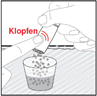 Schritt 8: Klopfen Sie den/die Beutel sorgfältig aus, damit das gesamte Granulat auf die weiche Nahrung in dem kleinen Gefäss gelangt. ·Achten Sie darauf, das gesamte Granulat in das Gefäss zu schütten. ·Überprüfen Sie, ob der/die Beutel leer ist/sind. ·Wenn Granulat verschüttet wird, wenden Sie sich an Ihren Arzt bzw. Ihre Ärztin.