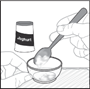 Schritt 10: Nehmen Sie das GESAMTE Prevymis-Gemisch ein. ·Prüfen Sie anschliessend, dass kein Granulat mehr im Gefäss oder am Löffel verbleibt. ·Wenn Sie Hunger haben, können Sie danach mehr von dem Lebensmittel oder eine Mahlzeit zu sich nehmen.