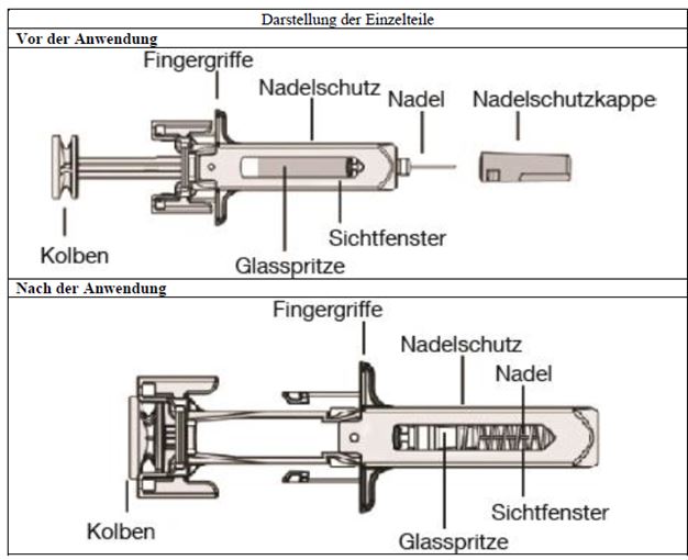 Die Fertigspritzen sind mit einem automatischen Nadelschutz versehen und werden in einer Blisterverpackung angeboten.