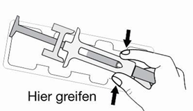 Für eine angenehmere Injektion belassen Sie die Fertigspritze vor der Injektion für etwa 30 Minuten bei Raumtemperatur. Waschen Sie Ihre Hände gründlich mit Wasser und Seife.
