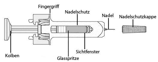 Spritze nach der Anwendung (Der Nadelschutz ist freigegeben und bedeckt die Nadel)