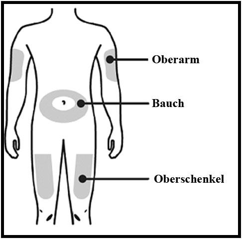 Sie können verwenden: ·die Vorderseite Ihres Oberschenkels, ·den Bauch, mit Ausnahme eines Bereiches von 5 cm um den Bauchnabel herum, ·die Rückseite des Oberarms (nur wenn Ihnen eine andere Person die Injektion gibt). Reinigen Sie die Injektionsstelle mit einem Alkoholtupfer. Lassen Sie Ihre Haut trocknen.