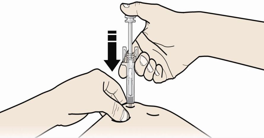 FÜHREN Sie die Nadel in die Haut EIN. Drücken Sie den Kolben, während Sie die Fingergriffe festhalten. Drücken Sie den Kolben bis zum Anschlag nach unten, um die gesamte Lösung einzuspritzen.