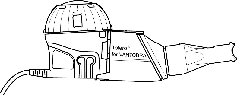 §Wenden Sie Vantobra nur mit dem in der Abbildung unten abgebildeten Tolero Vernebler an, um sicherzustellen, dass Sie die korrekte Dosis inhalieren. Verwenden Sie den Tolero Vernebler nicht für andere Arzneimittel. Vantobra sollte nicht verdünnt oder mit anderen Arzneimitteln gemischt werden.