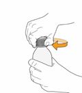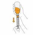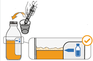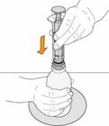 ·Prüfen Sie, ob bereits ein Flaschenadapter in den Flaschenhals eingesetzt ist. Wenn er nicht eingesetzt ist, nehmen Sie den Adapter von der Spritze ab und setzen Sie ihn ein. Für die weitere Anleitung siehe Schritt 4 und Schritt 10 in Abschnitt A. Wenden Sie sich an Ihren Arzt bzw. Ihre Ärztin, wenn Sie unsicher sind oder der Adapter fehlt.