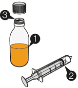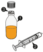 Zur Verabreichung von Mekinist als gebrauchsfertige Lösung benötigen Sie: 1.Lösung in der Flasche 2.Applikationsspritze für Zubereitungen zum Einnehmen 3.Adapter (bereits im Flaschenhals eingesetzt) Wenden Sie sich an Ihren Apotheker bzw. Ihre Apothekerin, wenn Ihnen eines oder mehrere dieser Hilfsmittel fehlen. Verabreichen Sie Mekinist nicht, wenn mehr als 35 Tage seit dem Datum vergangen sind, das auf dem Umkarton hinter «Lösung zubereitet am» steht. Im Falle eines Verschüttens oder eines Kontakts von Mekinist-Lösung mit der Haut oder den Augen, befolgen Sie die Informationen im Abschnitt «Reinigung von verschütteten Flüssigkeiten». Waschen und trocknen Sie Ihre Hände, bevor Sie Mekinest verabreichen.