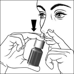 3. Führen Sie den Sprühkopf senkrecht in ein Nasenloch ein und sprühen Sie, indem Sie den Sprühkopf einmal nach unten drücken. Es empfiehlt sich, gleichzeitig durch die Nase einzuatmen und die andere Nasenöffnung zuzuhalten [siehe Abbildung 2].