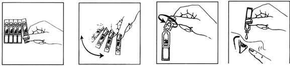Trennen Sie eine Einzeldosis vom Streifen, schütteln Sie den Inhalt nach vorne und öffnen Sie diese durch Abdrehen der Spitze. Diese bei nach hinten geneigtem Kopf möglichst senkrecht über das Auge halten, mit der anderen Hand das Unterlid leicht nach unten ziehen. Durch Druck einen Tropfen in den Bindehautsack fallen lassen, ohne dabei das Auge zu berühren. Gegebenenfalls das zweite Auge mit der gleichen Einzeldosis behandeln. Unbenutzen Restinhalt nicht aufbewahren, da die Lösung nicht konserviert ist, sondern SDU nach Gebrauch fortwerfen.